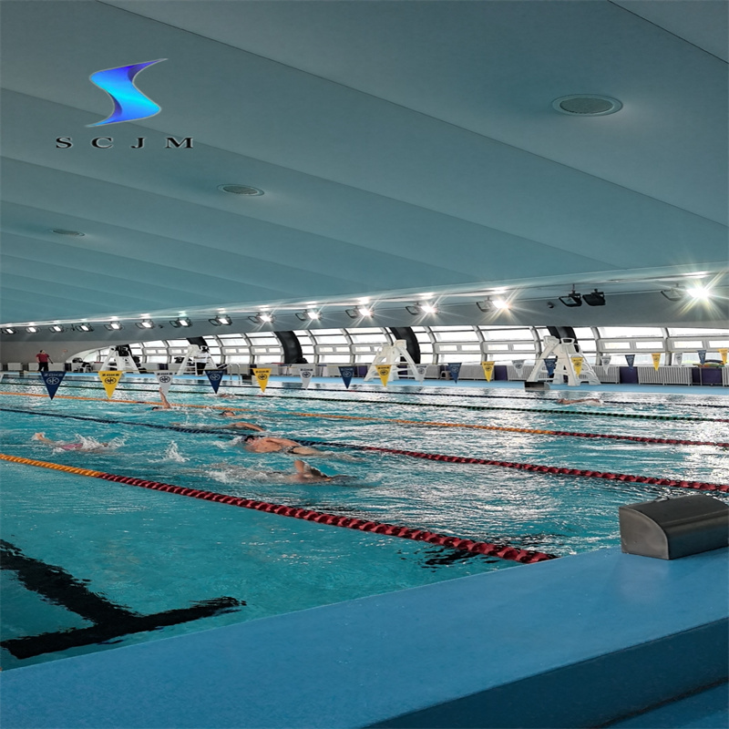 在標(biāo)準(zhǔn)泳池、跳水池、兒童戲水池等場(chǎng)景中,PVC膠膜形成無(wú)縫防水層,替代傳統(tǒng)瓷磚+防水涂料組合。以北京某奧運(yùn)場(chǎng)館改造項(xiàng)目為例,采用1.5mm厚PVC膠膜后,施工周期縮短60%,防水層使用壽命延長(zhǎng)至15年以上。材料表面經(jīng)壓花處理,摩擦系數(shù)達(dá)0.6-0.8,符合國(guó)際泳聯(lián)防滑標(biāo)準(zhǔn)。